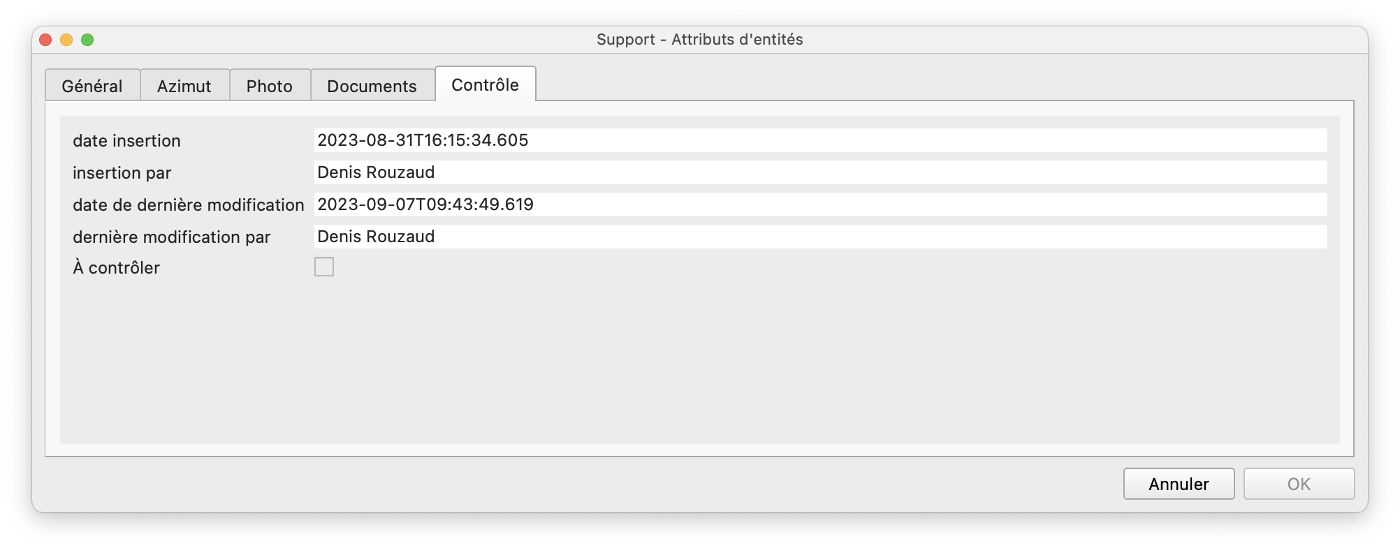 L'onglet "Contrôle" comporte des métadonnées sur les dernières modifications et si le support nécessite une validation des données modifiées. Voir aussi le chapitre Validation des changements pour les instructions détaillées.